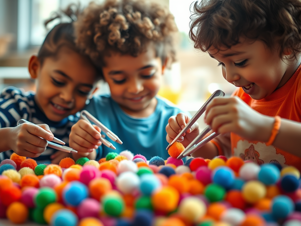 Pom-Pom Bin with Tweezers: Features various sizes of soft pom-poms and tweezers to practice fine motor control, particularly pincer grasp development.