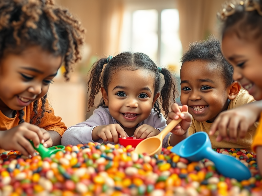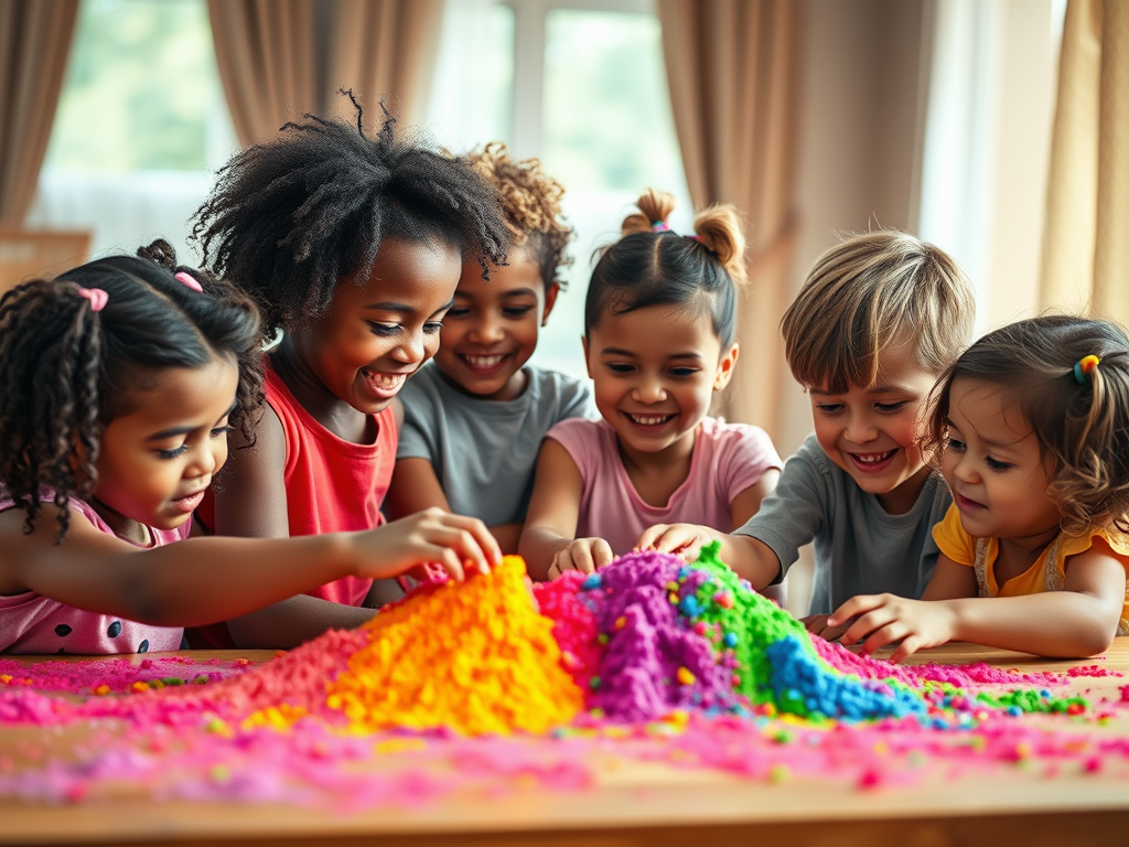 (Kinetic) Sand Bin with Hidden Objects: A bin filled with kinetic sand or regular sand that has hidden objects, encouraging tactile discrimination and fine motor skills through digging and exploring.